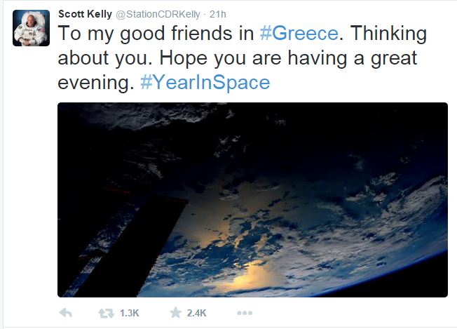Μήνυμα συμπαράστασης στην Ελλάδα από το διάστημα έστειλε χθες βράδυ ο Αμερικανός αστροναύτης Σκοτ Κέλι.