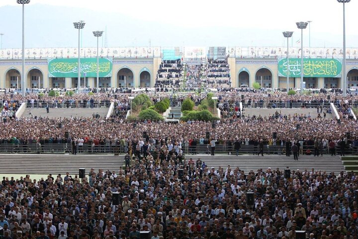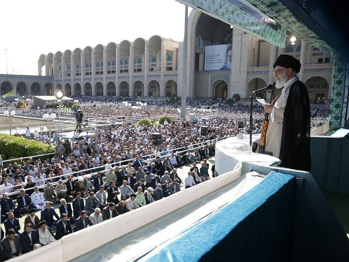 Ο Αλί Χαμενεΐ εκφώνησε το κήρυγμα -το πρώτο του μετά από σχεδόν πέντε χρόνια- ενώπιον χιλιάδων πιστών που κρατούσαν πορτρέτα των σκοτωμένων ηγετών του άξονα αντίστασης, του ηγέτη της Χεζμπολάχ, Χασάν Νασράλα και του ηγέτη της Χαμάς, Ισμαήλ Χανίγια.