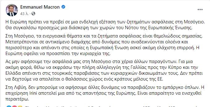 Ο Μακρόν καθιστά σαφές ότι «δεν πρέπει να δεχτούμε να απειλείται ο θαλάσσιος χώρος ενός κράτους μέλους της ΕΕ» , ενώ τονίζει ότι «η Ευρώπη οφείλει να προασπίσει την κυριαρχία της» και υπογραμμίζει: «Ας μην αφήσουμε την ασφάλειά μας στη Μεσόγειο στα χέρια άλλων παραγόντων.»