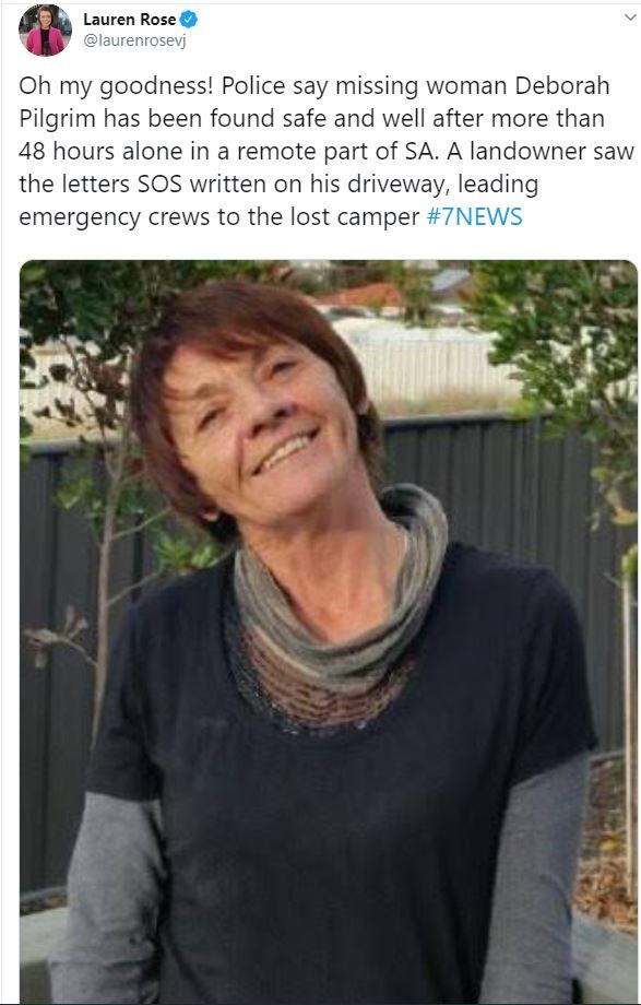 Η 55χρονη Ντέμπορα Πίλγκριμ χάθηκε την Κυριακή όταν, την ώρα που έκανε κάμπινγκ με φίλους της περίπου 100 χιλιόμετρα από την Αδελαΐδα, αποφάσισε να πάει μια βόλτα μόνη της.