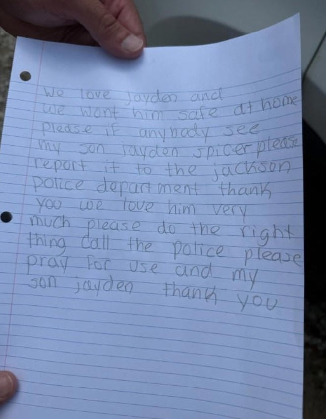 Μάλιστα σε γραπτό μήνυμα έκανε έκκληση για πληροφορίες που θα οδηγήσουν στον εντοπισμό του παιδιού. «Αγαπάμε τον Τζέιντεν και τον θέλουμε ασφαλή στο σπίτι. Σας παρακαλώ αν κάποιος δει τον γιο μου, Τζέιντεν Σπάισερ, σας παρακαλώ να το αναφέρει στο αστυνομικό τμήμα του Τζάκσον. Σας ευχαριστούμε. Τον αγαπάμε πολύ. Σας παρακαλώ κάντε το σωστό, καλέστε την αστυνομία. Σας παρακαλώ προσευχηθείτε για εμάς και τον γιο μου Τζέιντεν. Σας ευχαριστώ», ανέφερε στο μήνυμα η 33χρονη.