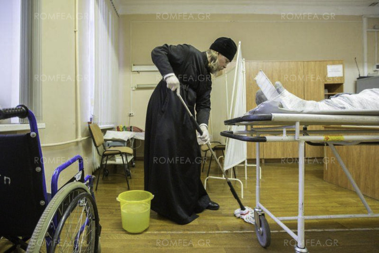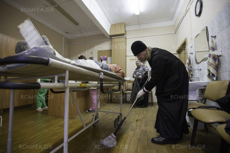 Ο Μητροπολίτης χωρίς να χάσει χρόνο άφησε την ράβδο και έβγαλε το εγκόλπιο, και άρχισε να σφουγγαρίζει τα δωμάτια των ασθενών.