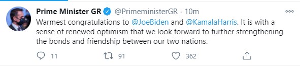 “Τα θερμότερα συγχαρητήριά μου στον Τζο Μπάιντεν και την Κάμαλα Χάρις. Με μια αίσθηση ανανεωμένης αισιοδοξίας, προσβλέπουμε στην περαιτέρω ενίσχυση των δεσμών μας και της φιλίας ανάμεσα στα δύο έθνη μας”, αναφέρει στα αγγλικά ο πρωθυπουργός.