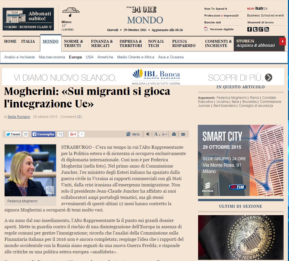 Η ΕΕ κινδυνεύει με διάλυση αν δεν ανταποκριθεί συλλογικά και με κοινοτικά εργαλεία στην προσφυγική κρίση, προειδοποιεί η επικεφαλής της ευρωπαϊκής διπλωματίας Φεντερίκα Μογκερίνι σε συνέντευξή της που δημοσιεύεται σήμερα στην εφημερίδα Il Sole 24 Ore.