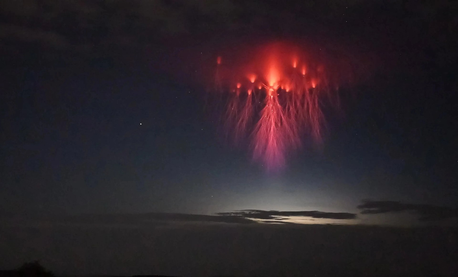 Το φαινόμενο αποτελεί έναν συνδυασμό δύο πολύ σπάνιων φαινομένων, γνωστά ως “κόκκινα σπρέι” (Red Sprites) και “ιονοσφαιρικών κεραυνών” (Blue Jets).