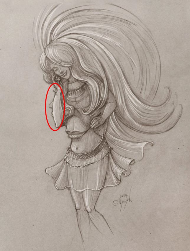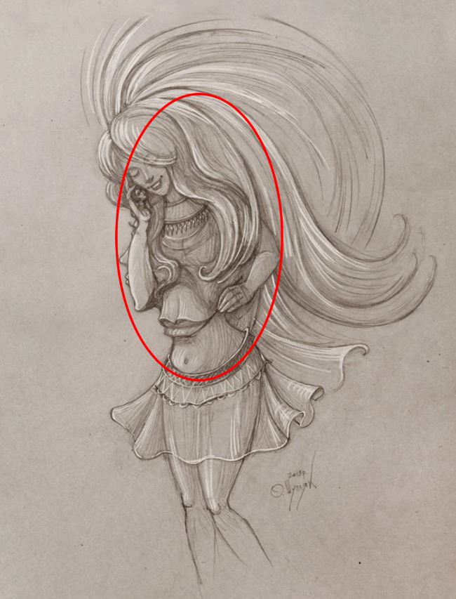 Το τρίτο θηλυκό αποτελείται από το φουσκωτό φόρεμα και τον αγκώνα της κυρίας, που προσδίδουν την εμφάνιση του προσώπου της σε προφίλ.