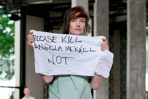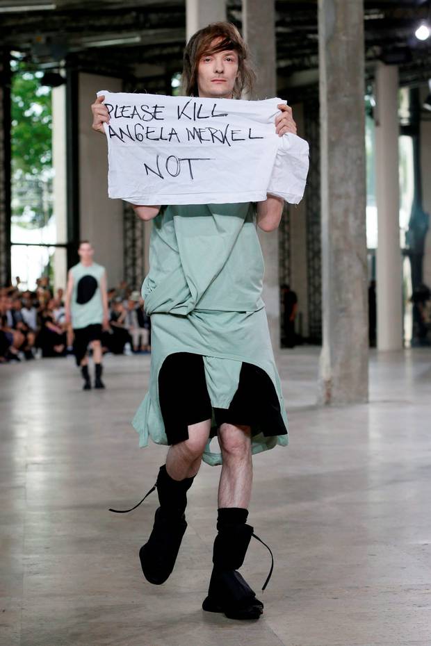 Στη μέση της παρουσίασης, ένα μοντέλο που σύμφωνα με το Γούμεν’ς Γουέρ Ντέιλι ονομάζεται «Ζέρα» έβγαλε ένα μικρό πανό στο οποίο αναγραφόταν μήνυμα κατά της καγκελαρίου της Γερμανίας, Άνγκελα Μέρκελ. Το πανό με τα κακογραμμένα, κεφαλαία γράμματα έλεγε: «PLEASE KILL ANGELA MERKEL — NOT».