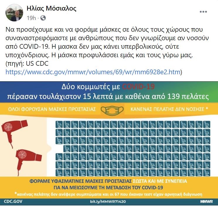 «Να προσέχουμε και να φοράμε μάσκες σε όλους τους χώρους που συναναστρεφόμαστε με ανθρώπους που δεν γνωρίζουμε αν νοσούν από COVID-19. Η μάσκα δεν μας κάνει υπερβολικούς, ούτε υποχόνδριους. Η μάσκα προφυλάσσει εμάς και τους γύρω μας», έγραψε χαρακτηριστικά στην ανάρτησή του ο κ. Μόσιαλος.
