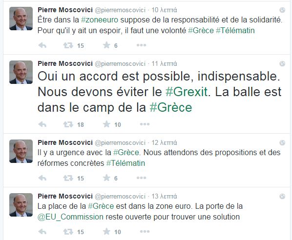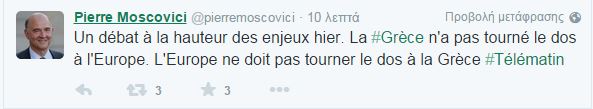“Η θέση της Ελλάδας είναι μέσα στο ευρώ. Η πόρτα της Κομισιόν είναι ανοιχτή για να βρούμε λύση” έγραψε πριν από λίγο στον προσωπικό λογαριασμό του στο twitter ο Επίτροπος Πιερ Μοσκοβισι.