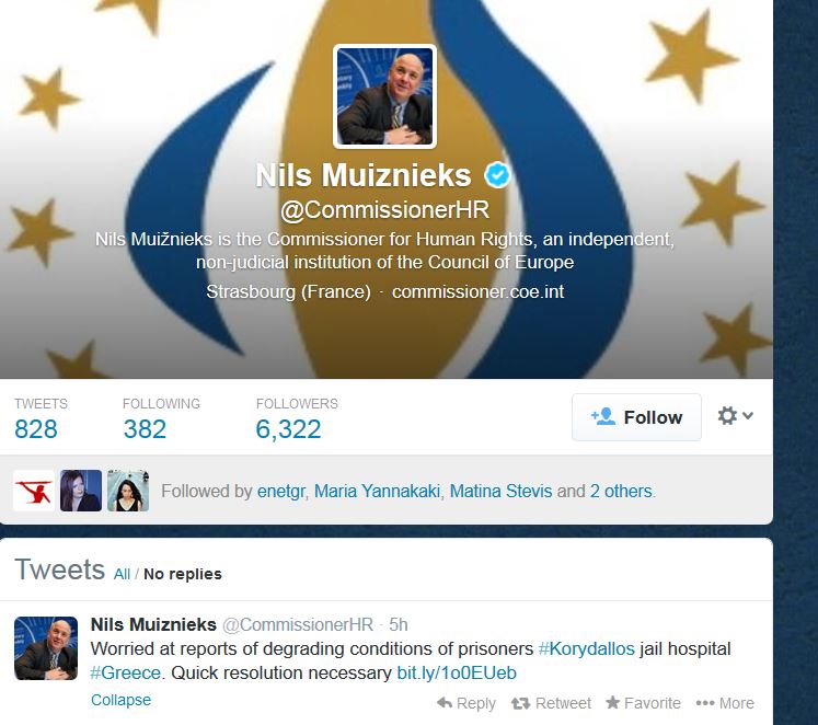 «Ανησυχούμε για τις ταπεινωτικές συνθήκες που βιώνουν οι φυλακισμένοι στο νοσοκομείο των φυλακών Κορυδαλλού. Πρέπει να βρεθεί άμεσα λύση», έγραψε ο Επίτροπος για τα Ανθρώπινα Δικαιώματα του Συμβουλίου της Ευρώπης στον λογαριασμό του στο Facebook.