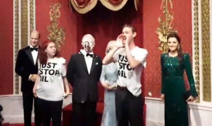 Οι ακτιβιστές για το κλίμα πέταξαν μία τούρτα στο κέρινο ομοίωμα του νέου μονάρχη της Βρετανίας και την άλειψαν στο πρόσωπό του. Τέσσερα άτομα συνελήφθησαν, ενώ στο βίντεο της οργάνωσης στο Twitter φαίνονται δύο άτομα να πλησιάζουν τα ομοιώματα της βασιλικής οικογένειας και αφότου αφαιρέσουν κάποια από τα ρούχα τους, αποκαλύπτουν το μήνυμα που είναι γραμμένο στα λευκά t-shirt, που είναι το: “Just stop oil”.