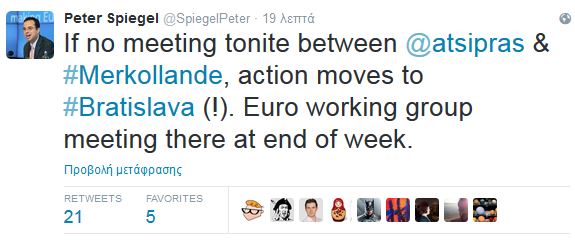Σύμφωνα με τον δημοσιογράφο των Financial Times αν δεν πραγματοποιηθεί τελικά η σημερινή συνάντηση η διαπραγμάτευση θα συνεχιστεί στο Euroworking Group την Παρασκευή που θα γίνει στην Μπρατισλάβα.