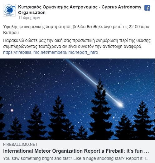 Ο Κυπριακός Οργανισμός Αστρονομίας σε ανάρτηση στο Facebook αναφέρει: “Υψηλής φαινομενικής λαμπρότητας βολίδα θεάθηκε λίγο μετά τις 22:00 ώρα Κύπρου. Παρακαλώ δώστε μας την δική σας προσωπική ενημέρωση περί της θέασης συμπληρώνοντας ταυτόχρονα αν είναι δυνατόν την αντίστοιχη αναφορά”.