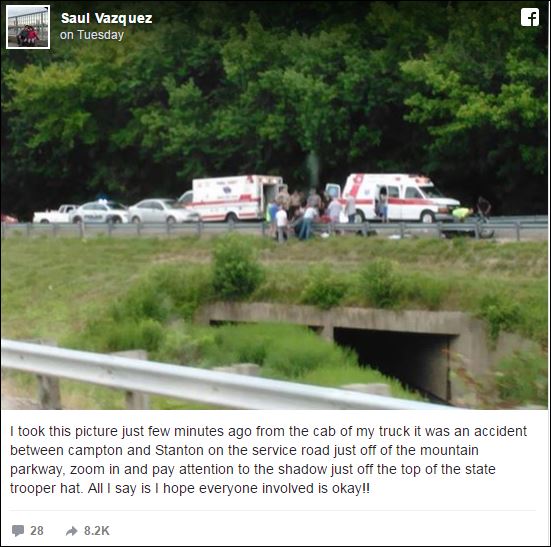 Ένας οδηγός φορτηγού που βρισκόταν στο σημείο όπου έλαβε χώρα το τραγικό δυστύχημα στο Κεντάκι των ΗΠΑ τράβηξε με το κινητό του την παράξενη φωτογραφία και τη δημοσίευσε στο Facebook, γράφοντας:«Τράβηξα αυτή τη φωτογραφία μόλις πριν από λίγα λεπτά, ενώ βρισκόμουν στο φορτηγό μου. Κάντε ζουμ και προσέξτε τη σκιά που βρίσκεται πάνω από το καπέλο του πολιτειακού αστυνομικού. Ελπίζω να είναι όλοι καλά».