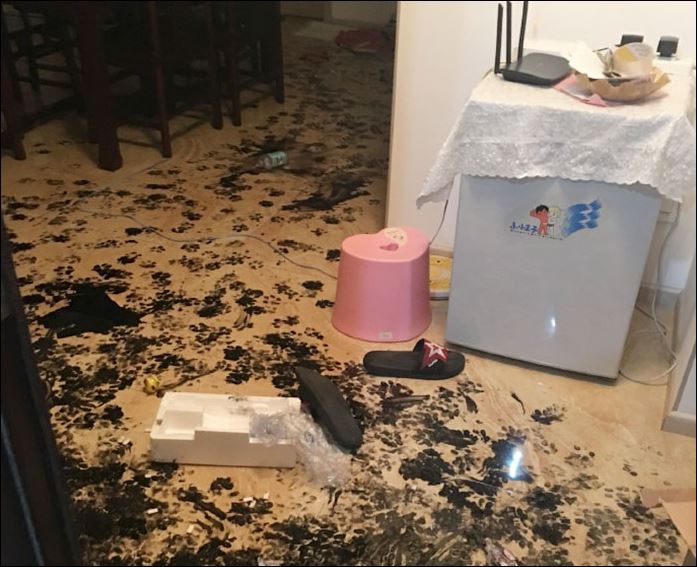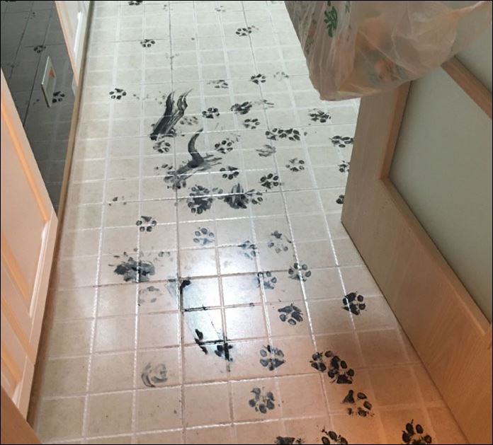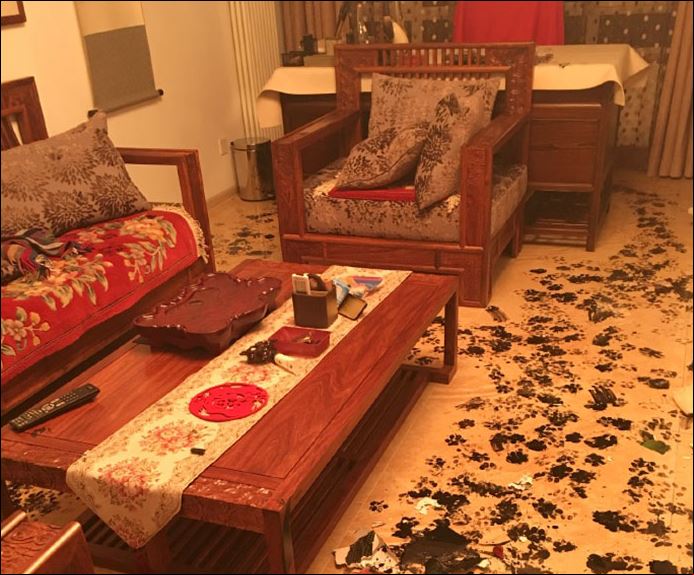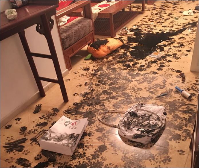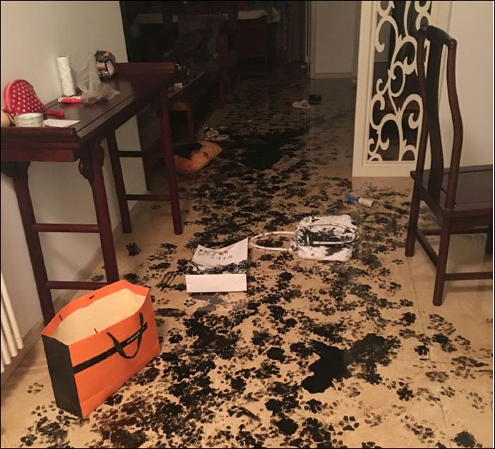 Ο σκύλος – καλλιτέχνης χρησιμοποίησε μελάνι που χρησιμοποιείται στην κινεζική καλλιγραφία, το οποίο βρήκε καταχωνιασμένο σε κάποιον αποθηκευτικό χώρο, και «διακόσμησε» το σπίτι με το προσωπικό του γούστο.