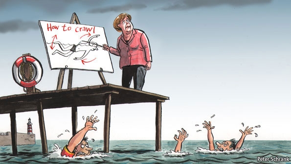 “Σας παρακαλούμε μπορύμε να βάλουμε μπρος τις μηχανές τώρα, κυρία Μέρκελ;”, γράφει το συννεφάκι, μέσα από το κέντρο ελέγχου του πλοίου “Παγκόσμια Οικονομία”.Το τεύχος θα περιέχει και ένα ακόμα καρτούν με την Γερμανίδα καγκελάριο να δίνει μαθήματα κολύμβησης στους σχεδόν πνιγμένους…