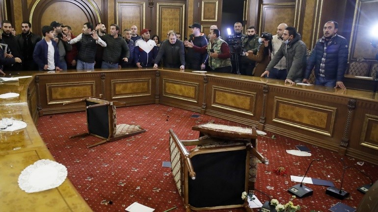 Πλήθος χιλιάδων εξοργισμένων διαδηλωτών συγκεντρώθηκε γύρω από τη Βουλή της Αρμενίας από τη στιγμή που μεταδόθηκε η είδηση για την υπογραφή της συμφωνίας και εκατοντάδες εξ αυτών εισέβαλαν στο κτίριο, έσπασαν παράθυρα και προκάλεσαν εκτεταμένες φθορές στο εσωτερικό του κοινοβουλίου, μεταδίδει δημοσιογράφος του Γαλλικού Πρακτορείου που βρίσκεται επιτόπου.