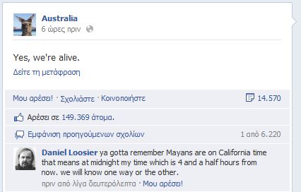 Με αυτή τη φράση απάντησε η σελίδα τουρισμού της Αυστραλίας, στο Facebook, στα μηνύματα των μακρινών φίλων της ηπείρου, που αγωνιούν να μάθουν πως ξημέρωσε η 21η Δεκεμβρίου για αυτούς.