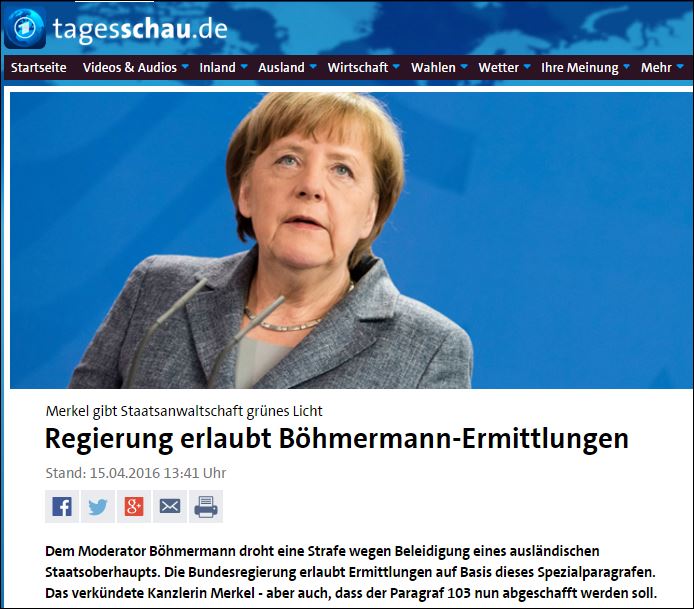 Η καγκελάριος Άνγκελα Μέρκελ αποφάσισε σήμερα να κάνει δεκτό το αίτημα της Άγκυρας για άσκηση ποινικών διώξεων σε βάρος του κωμικού Γιαν Μπέμερμαν ο οποίος απήγγειλε προσβλητικό ποίημα για τον Ερντογάν, σε εκπομπή της γερμανικής τηλεόρασης. Παράλληλα η Μέρκελ ανακοίνωσε ότι θέλει να καταργήσει τη διάταξη που επιτρέπει μια τέτοια διαδικασία.