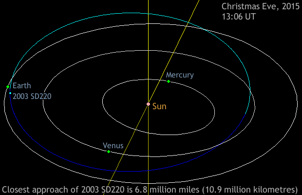 Πρόκειται για τον «2003 SD220», έναν αρκετά μεγάλο αστεροειδή, μήκους δύο χιλιομέτρων, ο οποίος περνά σε απόσταση περίπου 10,6 εκατομμυρίων χιλιομέτρων από τον πλανήτη μας (σχεδόν 28 φορές η απόσταση Γης-Σελήνης) την παραμονή των Χριστουγέννων.