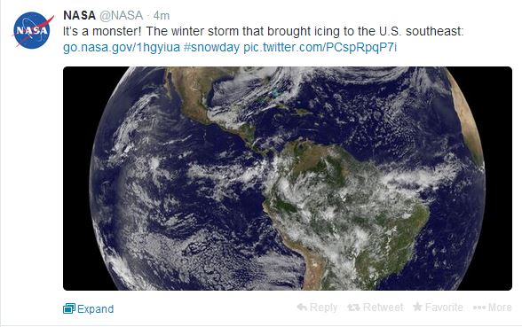 «Είναι ένα τέρας! Η χιονοθύελλα που φέρνει ψύχος στα νοτιοανατολικά των ΗΠΑ», έγραψε η NASA στη δημοσίευση που έκανε στο Twitter, με τη φωτογραφία από το Διάστημα που φαίνεται το εύρος της κακοκαιρίας.