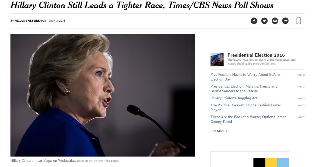 Προβάδισμα τριών μονάδων στη Χίλαρι Κλίντον έναντι του Ντόναλντ Τραμπ δίνει νέα δημοσκόπηση που διενεργήθηκε για λογαριασμό των New York Times και του CBS.