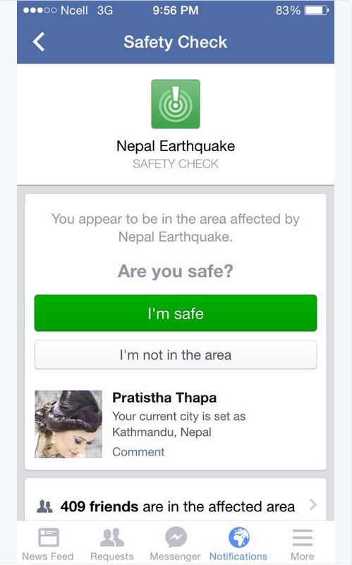 Στην προκειμένη περίπτωση, αν κάποιος χρήστης του Facebook έχει δηλώσει ως τόπο κατοικίας το Κατμαντού ή κάποια άλλη πόλη κοντά στο επίκεντρο του σεισμού, λαμβάνει μια ειδοποίηση με την ερώτηση αν είναι ασφαλής.  Απατώντας θετικά οι online φίλοι του ενημερώνονται σχετικά, μέσω μιας σελίδας που περιέχει πληροφορίες για το καταστροφικό γεγονός.