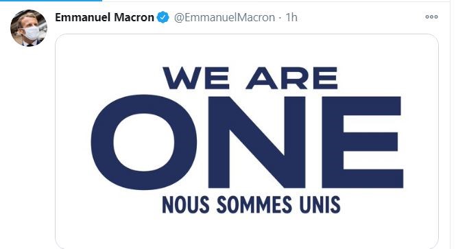 Από την πλευρά του, ο Γάλλος πρόεδρος έδωσε τη δική του απάντηση στον Τούρκο ομόλογό του με αναρτήσεις του στο twitter όπου επιβεβαίωσε τις αξίες που πρεσβεύει και υπογράμμισε μεταξύ άλλων ότι απορρίπτει τη “ρητορική του μίσους”. “Την ελευθερία, την αγαπάμε με πάθος, την ισότητα, την εγγυόμαστε, την αδελφοσύνη, τη ζούμε έντονα. Τίποτα δεν θα μας κάνει να υποχωρήσουμε, ποτέ. Η ιστορία μας είναι εκείνη της μάχης εναντίον των τυραννιών και των φανατισμών. Θα συνεχίσουμε. Θα συνεχίσουμε, Σεβόμαστε όλες τις διαφορές υπό το πνεύμα της ειρήνης. Δεν θα αποδεχθούμε ποτέ τον λόγο του μίσους και θα υπερασπιστούμε τον λογικό διάλογο. Θα συνεχίσουμε. Θα τασσόμαστε πάνω στο πλευρό της ανθρώπινης αξιοπρέπειας και των οικουμενικών αξιών”, έγραψε ο Γάλλος πρόεδρος, που παράλληλα ανήρτησε μηνύματα στα αγγλικά και τα αραβικά. Υπενθυμίζεται ότι ο Ερντογάν επιτέθηκε και σήμερα φραστικά εναντίον του Γάλλου ομολόγου του ενώ ο Μακρόν έγραψε στο Twitter τη φράση “Είμαστε ένα” στα αγγλικά (“We are ONE”), με υπότιτλο «είμαστε ενωμένοι». Η φράση “We are one” πρωταγωνιστεί στο τραγούδι “One”, του συγκροτήματος U2, το οποίο επέλεξε η οικογένεια του Σαμιέλ Πατί να ακουστεί στην τελετή μνήμης, την περασμένη Τετάρτη στη Σορβόνη, στον καθηγητή που δολοφονήθηκε από έναν 18χρονο Τσετσένο.