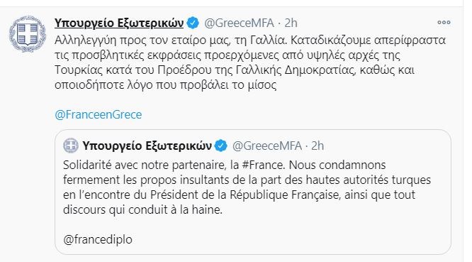 Επίσης, το ελληνικό υπουργείο Εξωτερικών με ανάρτησή του στο Twitter εξέφρασε την αλληλεγγύη του προς τον εταίρο της Ελλάδας, τη Γαλλία, με αφορμή τις προσβλητικές εκφράσεις του Ρετζέπ Ταγίπ Ερντογάν κατά του Εμανουέλ Μακρόν. «Καταδικάζουμε απερίφραστα τις προσβλητικές εκφράσεις προερχόμενες από υψηλές αρχές της Τουρκίαςκατά του Προέδρου της Γαλλικής Δημοκρατίας, καθώς και οποιοδήποτε λόγο που προβάλει το μίσος», ανέφερε χαρακτηριστικά.