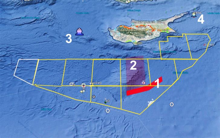 Πληροφορίες του Philenews, αναφέρουν ότι με βοηθητικό πλοίο που θα έπρεπε να εξυπηρετεί το άλλο τουρκικό γεωτρύπανο – το Fatih (Πορθητής), στην περιοχή κατεβάζουν υποβρύχια ρομπότ ώστε να μελετήσουν την διαμόρφωση του βυθού και να καθορίσουν το σημείο γεώτρησης. Στην φώτο, με αρ.1 η νέα περιοχή παράνομων σεισμογραφικών με το «Μπαρμπαρός». Με αρ. 2 η περιοχή στην οποία πραγματοποίησε σεισμογραφικές έρευνες το τελευταίο τρίμηνο το ίδιο σεισμογραφικό. Με αρ. 3 η θέση που βρίσκεται το τουρκικό γεωτρύπανο «Πορθητής» (Fatih) και με αρ. 4 η περιοχή που βρίσκεται το δεύτερο τουρκικό γεωτρύπανο, το Yavuz.