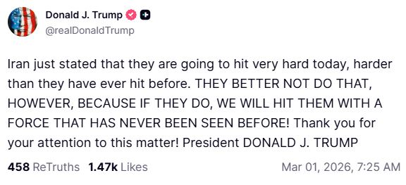 Συγκεκριμένα, ο Τραμπ ανέφερε πως το Ιράν δήλωσε ότι σκοπεύει να ανταποδώσει με εξαιρετική σφοδρότητα, γράφοντας χαρακτηριστικά: «Το Ιράν μόλις δήλωσε ότι πρόκειται να χτυπήσει πολύ σκληρά σήμερα, σκληρότερα από όσο έχουν χτυπηθεί ποτέ στο παρελθόν».