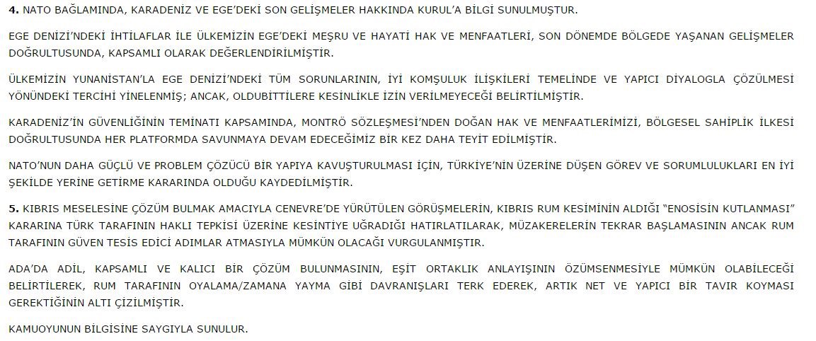 Σύμφωνα με την ανακοίνωση που εκδόθηκε μετά τα μεσάνυχτα της Τετάρτης, η Τουρκία προτιμά την «επίλυση των προβλημάτων μέσω του εποικοδομητικού διαλόγου με την Ελλάδα, αλλά σε καμία περίπτωση δεν θα επιτρέψει την δημιουργία τετελεσμένων». Επισημαίνεται δε πως «έγινε περιεκτική αξιολόγηση των διαφορών στο Αιγαίο και των νόμιμων και ζωτικών δικαιωμάτων και συμφερόντων της Τουρκίας στο Αιγαίο, σε σχέση με τις εξελίξεις της τελευταίας περιόδου».