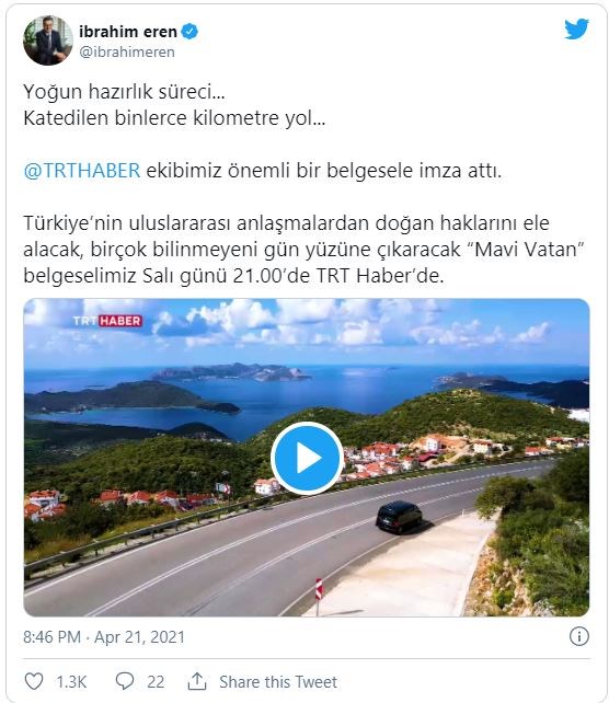 Με ανάρτησή του στο Twitter, o Γενικός διευθυντής του TRT Ιμπραήμ Ερέν, ο οποίος κατάγεται από την Θράκη, έκανε γνωστό πως το προκλητικό ντοκιμαντέρ: «προβάλλει τα δικαιώματα της Τουρκίας όπως απορρέουν από διεθνείς συμφωνίες».