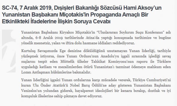 Επίθεση στον Πρωθυπουργό, Κυριάκο Μητσοτάκη για όσα είπε στο συνέδριο για το «Έγκλημα της Γενοκτονίας», εξαπέλυσε το τουρκικό ΥΠΕΞ.«Απορρίπτουμε ως αβάσιμους, ψευδείς και συκοφαντικούς τους εχθρικούς ισχυρισμούς του πρωθυπουργού της Ελλάδας, Κυριάκου Μητσοτάκη, κατά της ιστορίας μας αλλά και του σήμερα κατά την ομιλία του στο «Διεθνές Συνέδριο για το Έγκλημα της Γενοκτονίας» που οργανώθηκε στην Αθήνα στις 6-8 Δεκεμβρίου 2019» αναφέρει ανακοίνωση του τουρκικού υπουργείου Εξωτερικών.Παράλληλα, ο εκπρόσωπος του τουρκικού ΥΠΕΞ αναφέρεται με υποτιμητικό τρόπο στους Έλληνες κατά τη Μικρασιατική Καταστροφή και υπογραμμίζει ότι εκείνοι ήταν που διέπραξαν τις θηριωδίες κατά των Τούρκων πριν από έναν αιώνα. «Αν η ελληνική ηγεσία δεν μπορεί να ξεχάσει ότι τους ρίξαμε στο Αιγαίο κατά τη διάρκεια του Πολέμου της Ανεξαρτησίας και θέλει να έρθει αντιμέτωπη με την ιστορία, θα πρέπει πρώτα να κοιτάξει τη Συνθήκη της Λωζάννης, η οποία καταδίκασε την Ελλάδα να καταβάλει αποζημίωση για τις σφαγές, τις θηριωδίες και τα εγκλήματα πολέμου, που, σύμφωνα με την έκθεση της Διερευνητικής Επιτροπής των Συμμαχικών χωρών, διέπραξε ο ελληνικός στρατός εναντίον των Τούρκων κατά τη διάρκεια της κατοχής της Ανατολίας». Τέλος, η Αγκυρα καλεί την ελληνική κυβέρνηση να συμπεριφέρεται με βάση τις αρχές τις φιλίας και της καλής γειτονίας. «Καλούμε την ελληνική ηγεσία, όπως έκανε κι ο έλληνας πρωθυπουργός Βενιζέλος, που υπέδειξε υποψήφιο για το βραβείο Νόμπελ Ειρήνης το μεγάλο ηγέτη Ατατούρκ, τον ιδρυτή της Τουρκικής Δημοκρατίας και αγωνιστή κατά του κατοχικού ελληνικού στρατού, να σταματήσει να ονειροβατεί και να ακολουθήσει τις αρχές της φιλίας και της καλής γειτονίας». Η ανακοίνωση του τουρκικού ΥΠΕΞ: