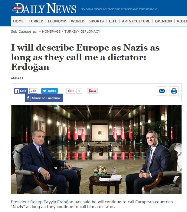 Σε νέα προκλητική δήλωση προχώρησε ο Πρόεδρος της Τουρκίας Ρετζέπ Ταγίπ Ερντογάν λέγοντας ότι «θα συνεχίσω να αποκαλώ τις ευρωπαϊκές χώρες ναζί, όσο με αποκαλούν δικτάτορα», σύμφωνα με δημοσίευμα της Hurriyet.«Έχετε την ελευθερία να αποκαλείτε τον Ερντογάν δικτάτορα, αλλά ο Ερντογάν δεν έχει την ελευθερία να σας αποκαλεί φασίστες ή ναζί. Μην προσβάλλεστε, αλλά θα συνεχίσω να χρησιμοποιώ τους ίδιους όρους για αυτούς, όσο αποκαλούν τον Ερντογάν δικτάτορα», είπε ο Τούρκος Πρόεδρος, σε τηλεοπτική του συνέντευξη.Ο Ερντογάν πρόσθεσε ότι δεν έχει σκοπό να επισκεφτεί τη Γερμανία πριν από τη διεξαγωγή του δημοψηφίσματος στην Τουρκία.Αναφερόμενος στον Πρόεδρο του Ευρωπαϊκού Κοινοβουλίου Ντόναλντ Τουσκ ο Πρόεδρος της Τουρκίας σημείωσε ότι «ο Πρόεδρος Τουσκ κάνει δηλώσεις εναντίον μου παρότι είναι φίλος μου… Θα πρέπει να κοιτάξουμε στον καθρέφτη. Θα πρέπει να γνωρίζουν ότι όσοι το τραβάνε θα πάρουν ακριβώς την ίδια απάντηση και από εμάς».