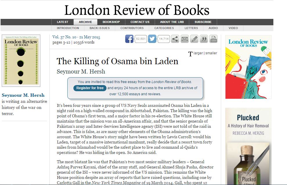 Στο άρθρο του, που δημοσιεύτηκε στο London Review of Books, ο Χερς υποστηρίζει ότι η Ουάσινγκτον είχε προειδοποιήσει τις πακιστανικές αρχές για την επιχείρηση των αμερικανικών ειδικών δυνάμεων στο κρησφύγετο του μπιν Λάντεν στην πόλη Αμποταμπάντ. Τη Δευτέρα ο Λευκός Οίκος διέψευσε κατηγορηματικά αυτή τη θεωρία επαναλαμβάνοντας ότι το Πακιστάν ενημερώθηκε μετά την ολοκλήρωση της επιχείρησης.