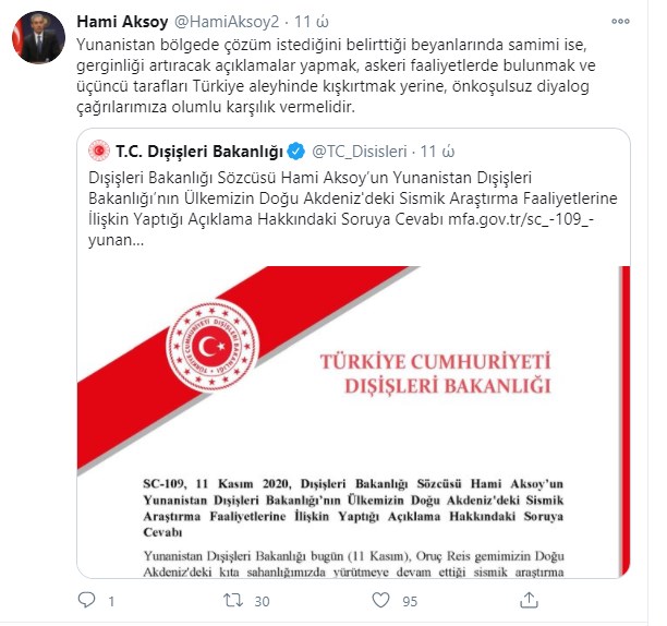 Το τουρκικό ΥΠΕΞ, σε ανακοίνωσή του, αναφέρει ότι “το ελληνικό ΥΠΕΞ εξέδωσε άλλη μια ανακοίνωση με την οποία επανέλαβε τις γνωστές του αντιρρήσεις σχετικά με τις σεισμικές έρευνες που το πλοίο μας Ορούτς Ρέις συνεχίζει να διεξάγει στην υφαλοκρηπίδα μας στην ανατολική Μεσόγειο. Αυτές οι δηλώσεις βασίζονται στις μαξιμαλιστικές αξιώσεις της Ελλάδας για τα θαλάσσια όρια οι οποίες είναι αντίθετες με το διεθνές δίκαιο και τη διεθνή πρακτική και δεν έχουν καμία ισχύ και αξία για εμάς”. Παράλληλα, προστίθεται ότι “η Τουρκία θα συνεχίσει με αποφασιστικότητα να προστατεύει τόσο τα δικά της νόμιμα δικαιώματα και συμφέροντα όσο και της ‘ΤΔΒΚ'” (ψευδοκράτος).
