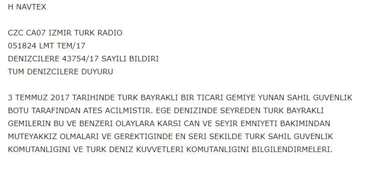 Οι Τούρκοι εξέδωσαν NAVTEX (43754), στην οποία αναφέρουν ότι “πλοίο της Ελληνικής Ακτοφυλακής άνοιξε πυρ κατά εμπορικού πλοίου με σημαία Τουρκίας” και στη συνέχεια επισημαίνουν ότι “για την προστασία των πλοίων υπό τουρκική σημαία τα οποία πλέουν στο Αιγαίο, όπως για κάθε συμβάν να ενημερώνεται άμεσα και με κάθε πρόσφορο μέσο το Τ/ΠΝ και η Τ/ΔΑΑ οι οποίες επαγρυπνούν για την ασφάλεια”.Δείτε την τουρκική NAVTEX;
