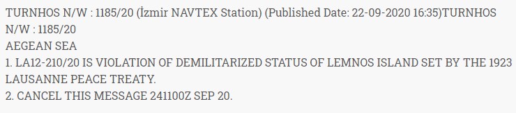 Συνεχίζουν να προκαλούν οι Τούρκοι που με αντι-Navtex από τον Σταθμό της Σμύρνης ζητούν την αποστρατιωτικοποίηση της Λήμνου. Σύμφωνα με την τουρκική Navtex, η οποία έρχεται λίγες ημέρες μετά από αντίστοιχη ναυτική οδηγία για τη Χίο, παραβιάζεται η Συνθήκη της Λωζάνης.