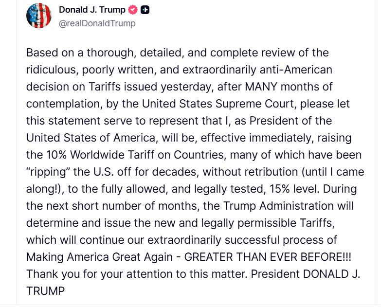 «Ύστερα από μια ενδελεχή, λεπτομερή και πλήρη εξέταση της γελοίας, κακογραμμένης και εξαιρετικά αντιαμερικανικής απόφασης για τους δασμούς που εκδόθηκε χθες, μετά από πολλούς μήνες περισυλλογής, από το Ανώτατο Δικαστήριο των Ηνωμένων Πολιτειών, παρακαλώ η παρούσα δήλωση να χρησιμεύσει ως εκπροσώπηση του ότι εγώ, ως Πρόεδρος των Ηνωμένων Πολιτειών της Αμερικής, θα αυξήσω, με άμεση ισχύ, τον Παγκόσμιο Δασμό 10% στις χώρες -πολλές από τις οποίες «γδύνουν» τις ΗΠΑ εδώ και δεκαετίες, χωρίς τιμωρία (μέχρι που ήρθα εγώ!) – στο πλήρως επιτρεπόμενο και νομικά ελεγμένο επίπεδο του 15%.