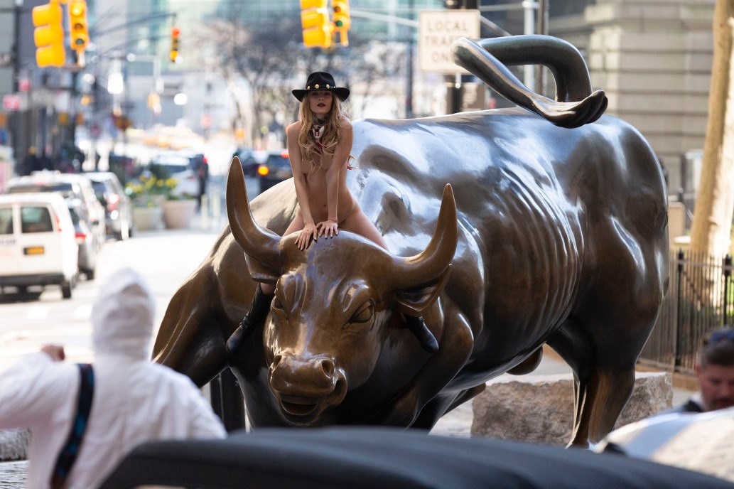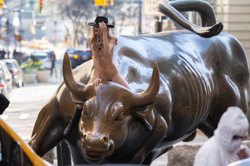 Viral έχουν γίνει οι φωτογραφίες μίας ξανθιάς καλλονής από την καρδιά της οικονομικής συνοικίας της Νέας Υόρκης, κοντά στη Wall Street, όταν πόζαρε γυμνή πάνω στο μπρούτζινο ταύρο, αγνοώντας τα μέτρα προστασίας κατά του κορονοϊού.