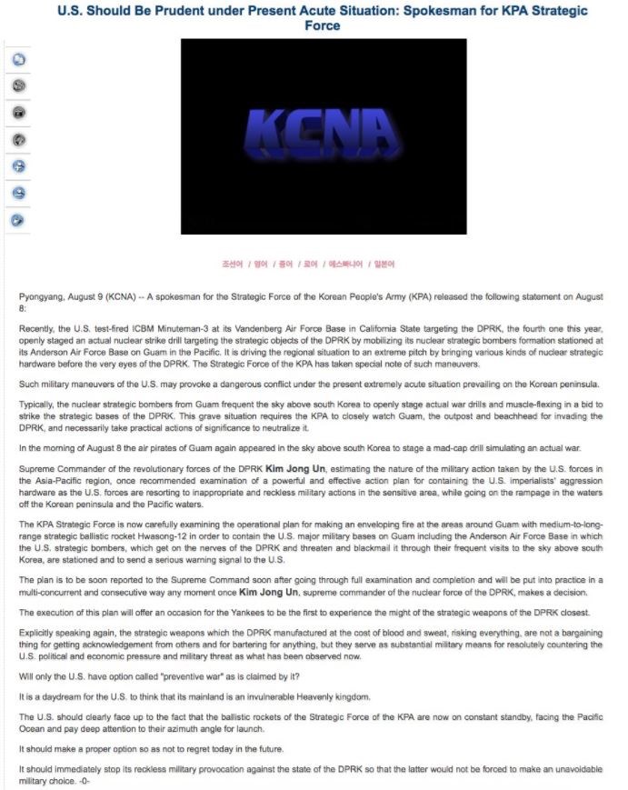Εκπρόσωπος του Λαϊκού Στρατού της Κορέας δήλωσε μέσω του εθνικού πρακτορείου ειδήσεων της Βόρειας Κορέας KCNA ότι το πρόγραμμα επίθεσης θα «τεθεί σε εφαρμογή οποιαδήποτε στιγμή με πολλαπλό και διαδοχικό τρόπο» μόλις λάβει την απόφαση ο ηγέτης της χώρας Κιμ Γιονγκ Ουν.