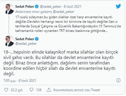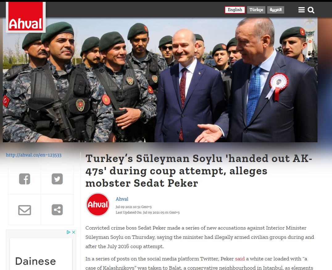 Σε νέες αποκαλύψεις που βάζουν “φωτιά” στο πολιτικό σκηνικό της Τουρκίας προέβη μέσω Twitter ο αρχιμαφιόζος, Σεντάτ Πεκέρ, ο οποίος υποστηρίζει πως ο υπουργός Εσωτερικών, Σουλεϊμάν Σοϊλού εφοδίαζε με καλάσνικοφ πολιτικές ομάδες τόσο κατά τη διάρκεια όσο και μετά την απόπειρα πραξικοπήματος του 2016.