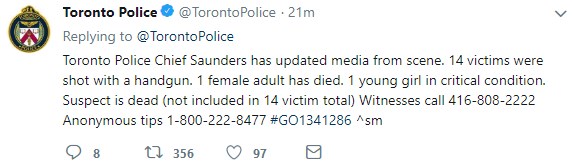 Η αστυνομία του Τορόντο ανέφερε ότι μία γυναίκα έχασε τη ζωή της από την επίθεση στην ελληνική συνοικία του Τορόντο, ενώ ένα κορίτσι νοσηλεύεται σε κρίσιμη κατάσταση.
