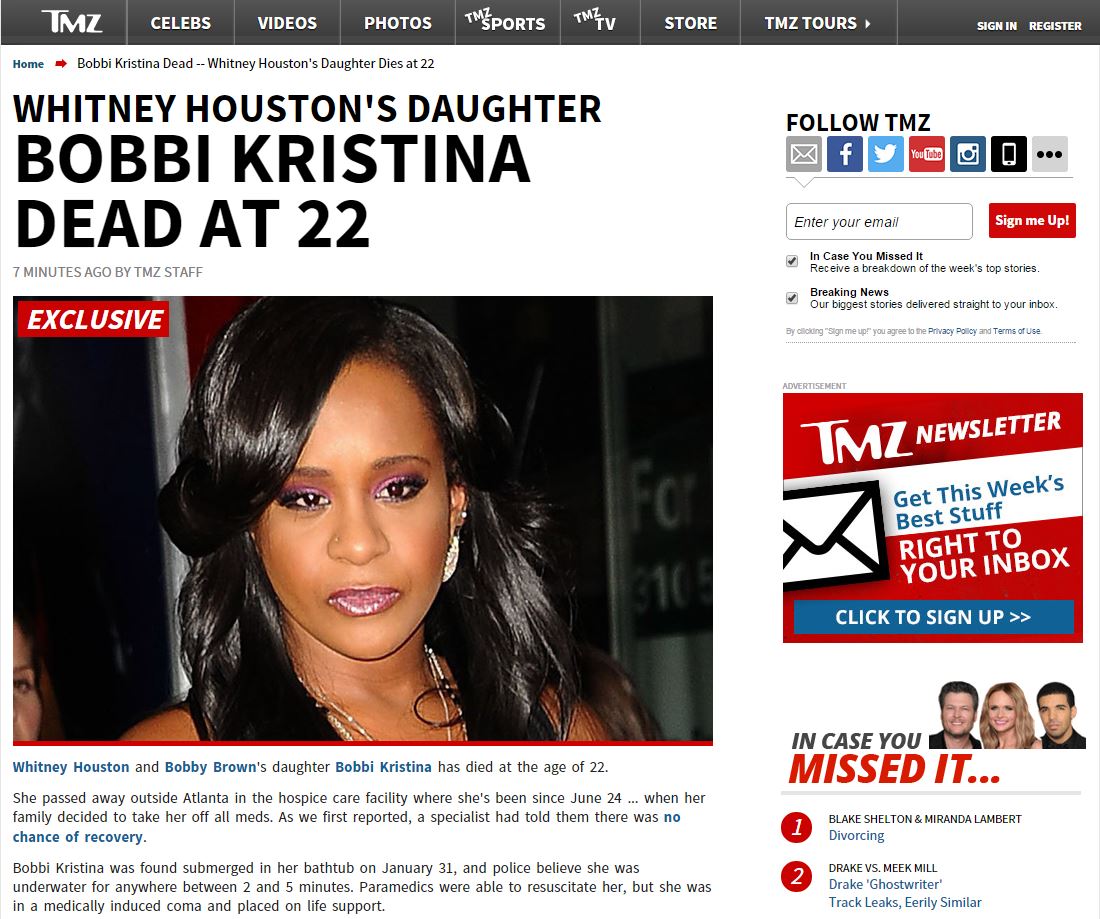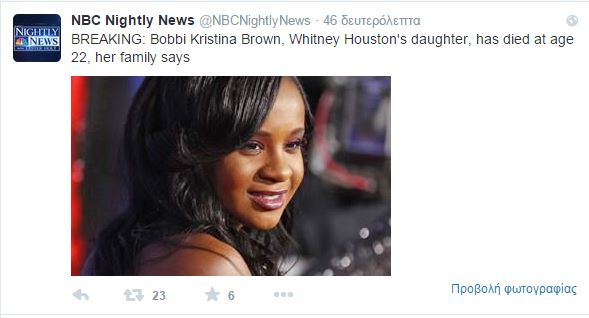Σύμφωνα με τα αμερικανικά μέσα ενημέρωσης στο Twitter, η Μπόμπι Κριστίνα Μπράουν κατέληξε στο κέντρο περίθαλψης ασθενών σε τελικό στάδιο, μήνες αφότου βρέθηκε αναίσθητη μέσα στη μπανιέρα του σπιτιού της.