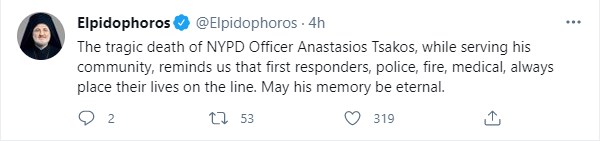 Σε ανάρτηση του στο Twitter ο Αρχιεπίσκοπος Αμερικής Ελπιδοφόρος αναφέρθηκε στην προσφορά του αστυνομικού στην κοινότητα. «Ο Τραγικός θάνατος του Αναστάσιου Τσάκου αστυνομικου του Αστυνομικού Τμήματος Νέας Υόρκης κατά την διάρκεια υπηρεσίας αλλά και προσφοράς στον συνάνθρωπο μας υπενθυμίζει ότι όλοι οι αστυνομικοί, πυροσβέστες και ιατρικό προσωπικό ρισκάρουν την ζωή τους για εμάς. Αιωνία του η μνήμη» έγραψε.