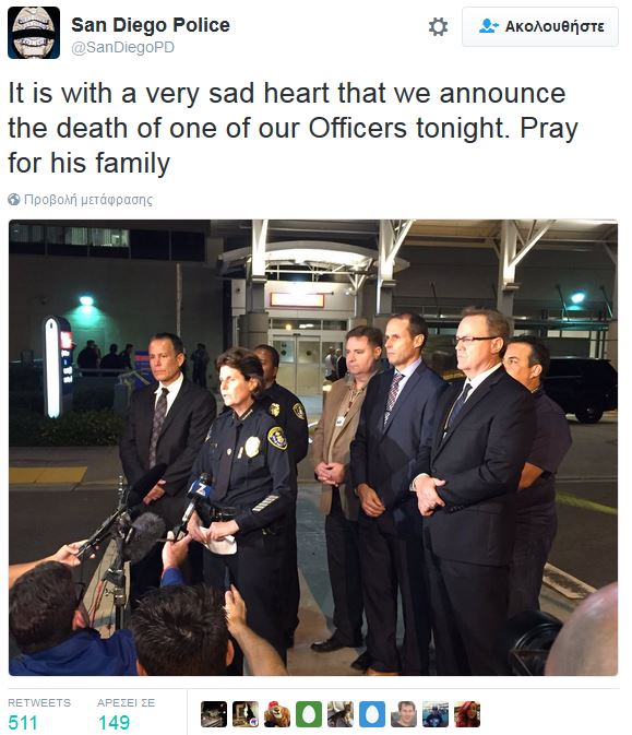 Κατέληξε ο ένας από τους δύο αστυνομικούς που τραυματίστηκαν στο Σαν Ντιέγκο των ΗΠΑ, όπως ανακοίνωσε η αστυνομία της πόλης.