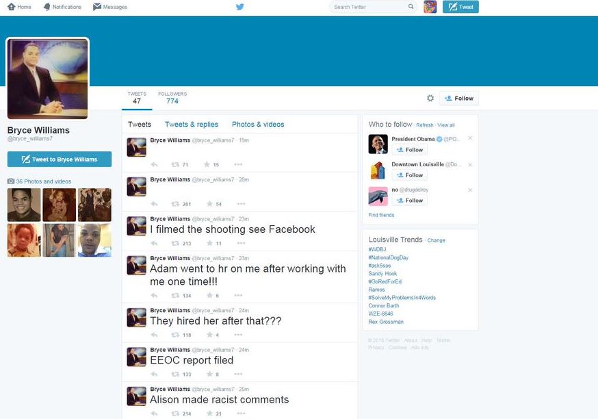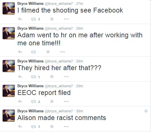 Στο βίντεο που εμφανίζεται στον λογαριασμό του χρήστη @bryan_williams7 διακρίνεται ένα πιστόλι που στοχεύει τη νεαρή δημοσιογράφο Άλισον Πάρκερ, όμως κανείς δεν το προσέχει. Κατόπιν η κάμερα χαμηλώνει και ακολουθούν πυροβολισμοί προς την πλευρά των θυμάτων.