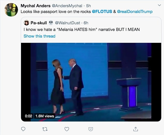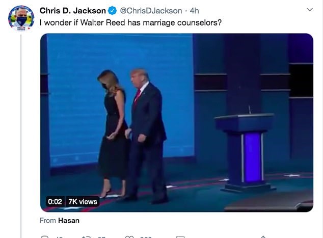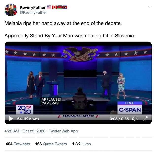 Νέο επεισόδιο συζυγικής… τρυφερότητας είχαμε ανάμεσα στον Ντόναλντ Τραμπ και τη Μελάνια. Μετά την ολοκλήρωση του τελευταίου ντιμπέιτ με τον Δημοκρατικό αντίπαλό του Τζο Μπάιντεν, η Πρώτη Κυρία των ΗΠΑ ανέβηκε στη σκηνή και στάθηκε δίπλα στον σύζυγό της, χωρίς να τον αγκαλιάσει ούτε να τον συγχαρεί. Στάθηκε δίπλα του, κρατήθηκαν από το χέρι, φωτογραφήθηκαν. Επίσης, στη σκηνή ανέβηκε και η σύζυγος του Τζο Μπάιντεν, η οποία τον αγκάλιασε σφιχτά και στάθηκε κοντά του δίνοντας μήνυμα ενότητας και στήριξης. Τη στιγμή που τα δύο ζευγάρια αποχωρούσαν από τη σκηνή προς αντίθετες κατευθύνσεις η κάμερα κατέγραψε τη Μελάνια να τραβά το χέρι της από την παλάμη του Ντόναλντ Τραμπ, πλάνα που σχολιάζονται ποικιλοτρόπως άλλη μια φορά. Οι χρήστες του twitter οργίασαν.