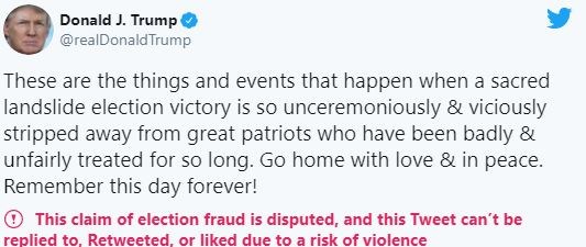 Ο απερχόμενος πρόεδρος των ΗΠΑ επιμένει στα περί “κλοπής της εκλογικής νίκης” και καλεί τους διαδηλωτές να επιστρέψουν σπίτια τους “με αγάπη και ειρήνη”. Σημειώνει, ωστόσο, ότι “να θυμάστε αυτή την ημέρα για πάντα”.